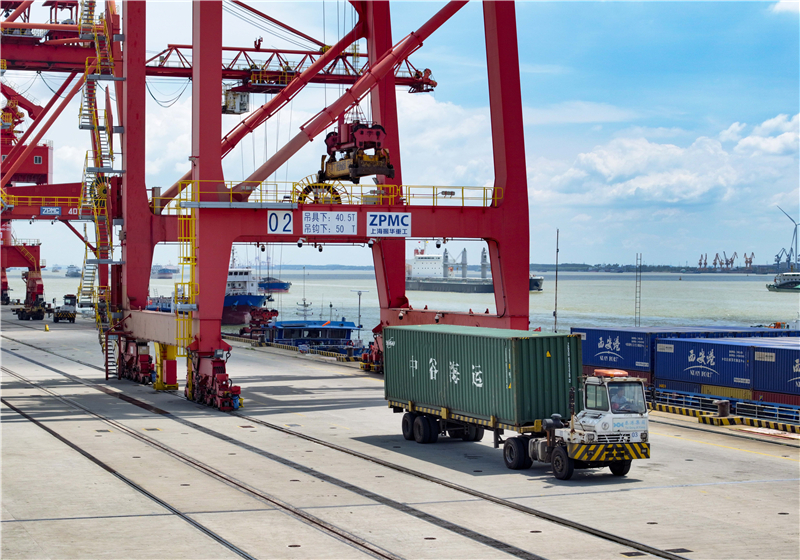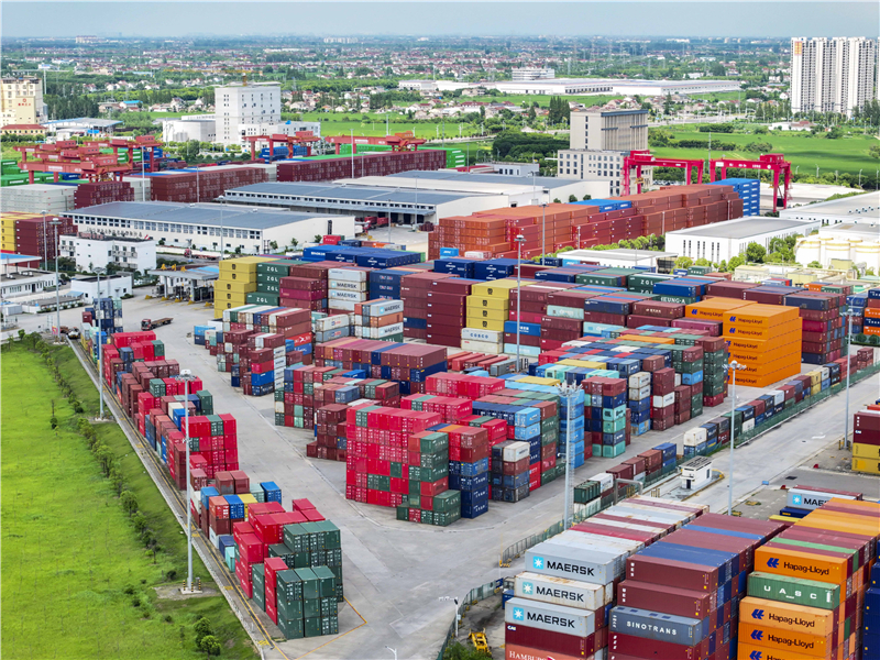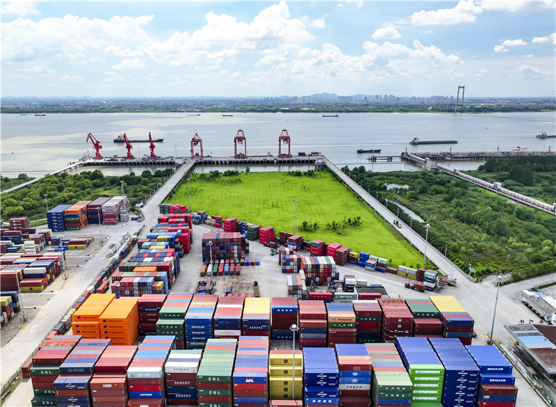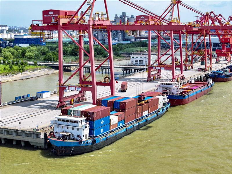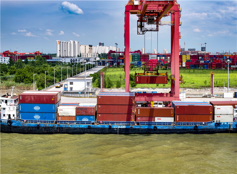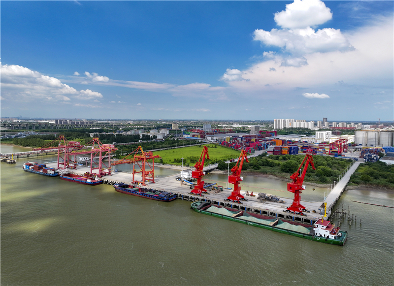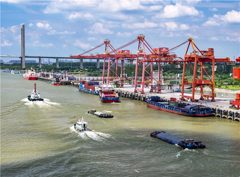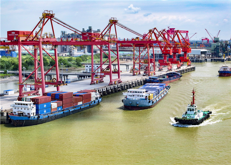 8月7日,江苏泰州国际集装箱码头呈现繁忙作业场景,多艘货轮有序停靠泊位进行集装箱装卸作业。(顾继红 平波)